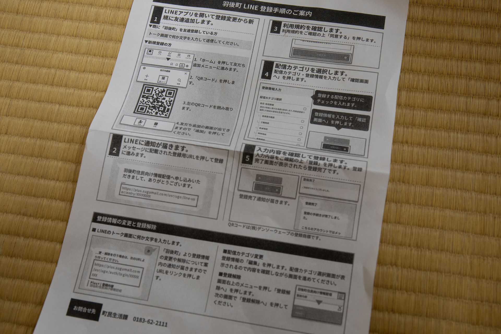 今回の「住民と議会の懇談会」では受付時に、懇談会アンケートのほか、すべての会場で「羽後町LINE」の登録手順を記した用紙が配布されました。