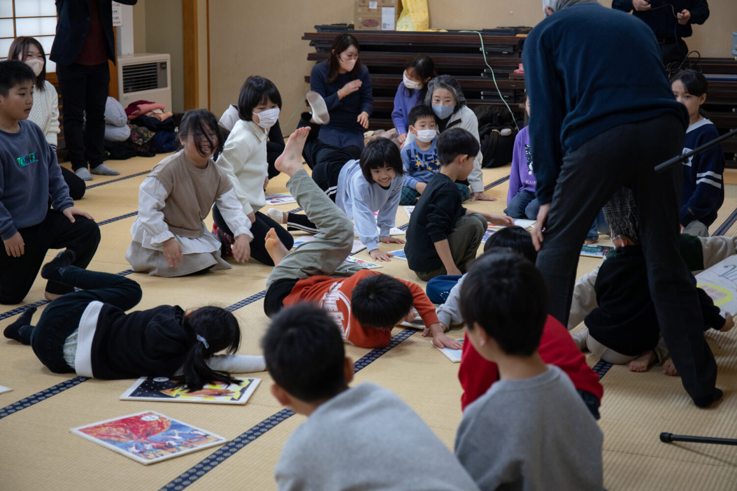 まずは「大型かるた遊び」から。巨大なかるたを使い、体を目一杯使って札をゲットします。その様子はさながらスポーツ。時には遠くにある札めがけて全力ダッシュ!子どもがメインの種目とあって「勇気があったら一般の参加者も募集中です」とのアナウンスメントも、白熱した雰囲気に大人たちはたじたじ。