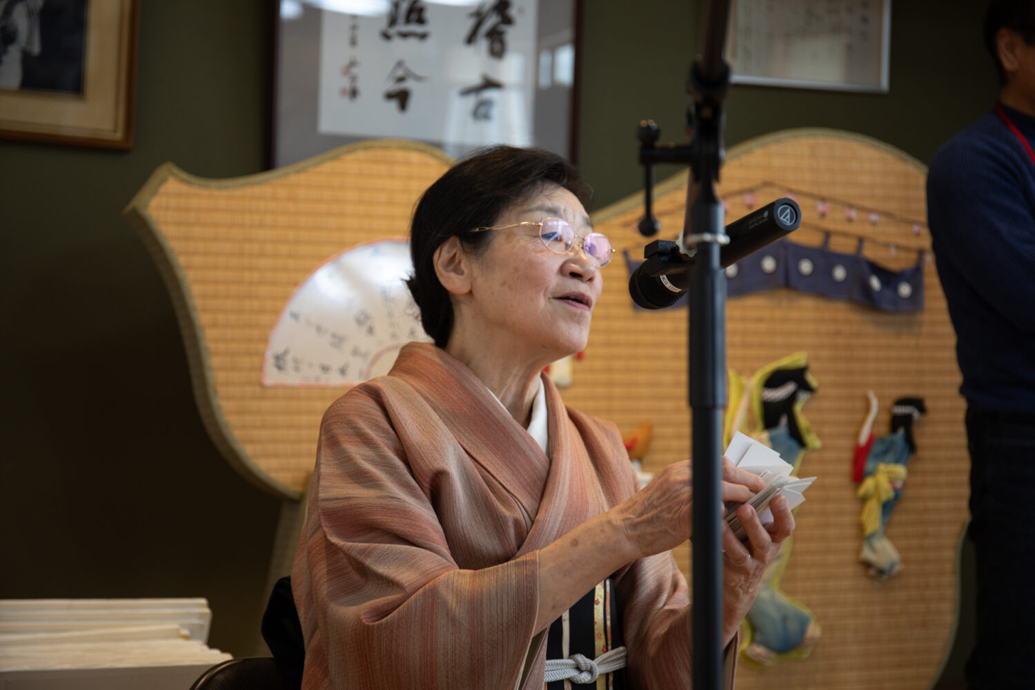 今年の郷土かるた大会にて、かるたを読み上げる藤原祐子さん
