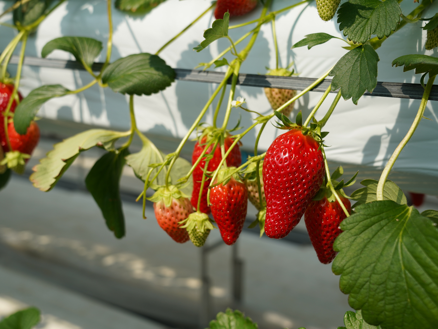 いちご狩りは完全予約制で、生育状況に応じて毎年1月〜6月中旬くらいまで営業しています。昼と夜の寒暖差があり、日中も暑すぎない今の時期はベストシーズンだそう。