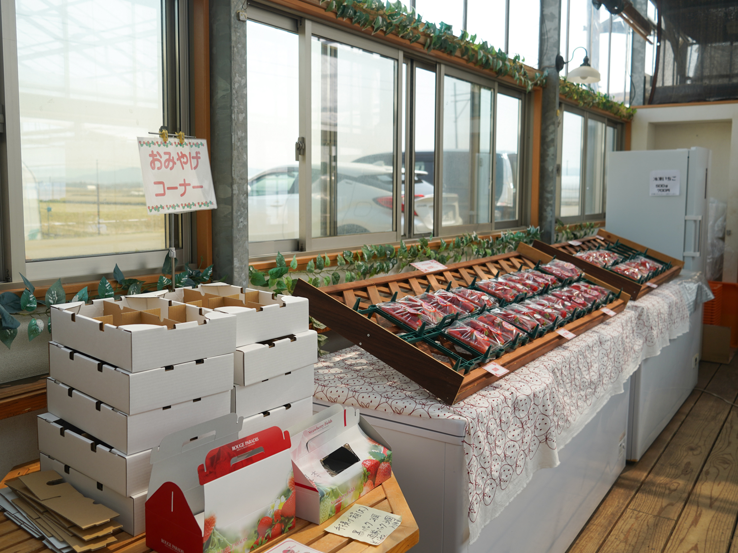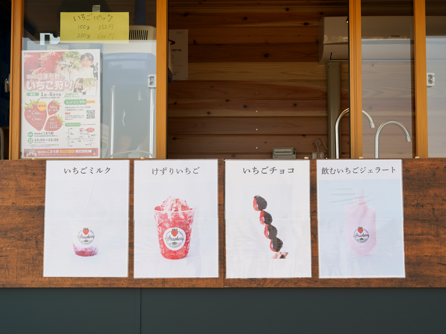 いちご狩りの後は、パック入りのいちごも購入可能!農園に隣接するおみやげコーナーには、こまち野産のいちごがずらり。品種ごとの解説も掲載されているので、気になるものを購入してお土産に持って帰るのもよさそうです。